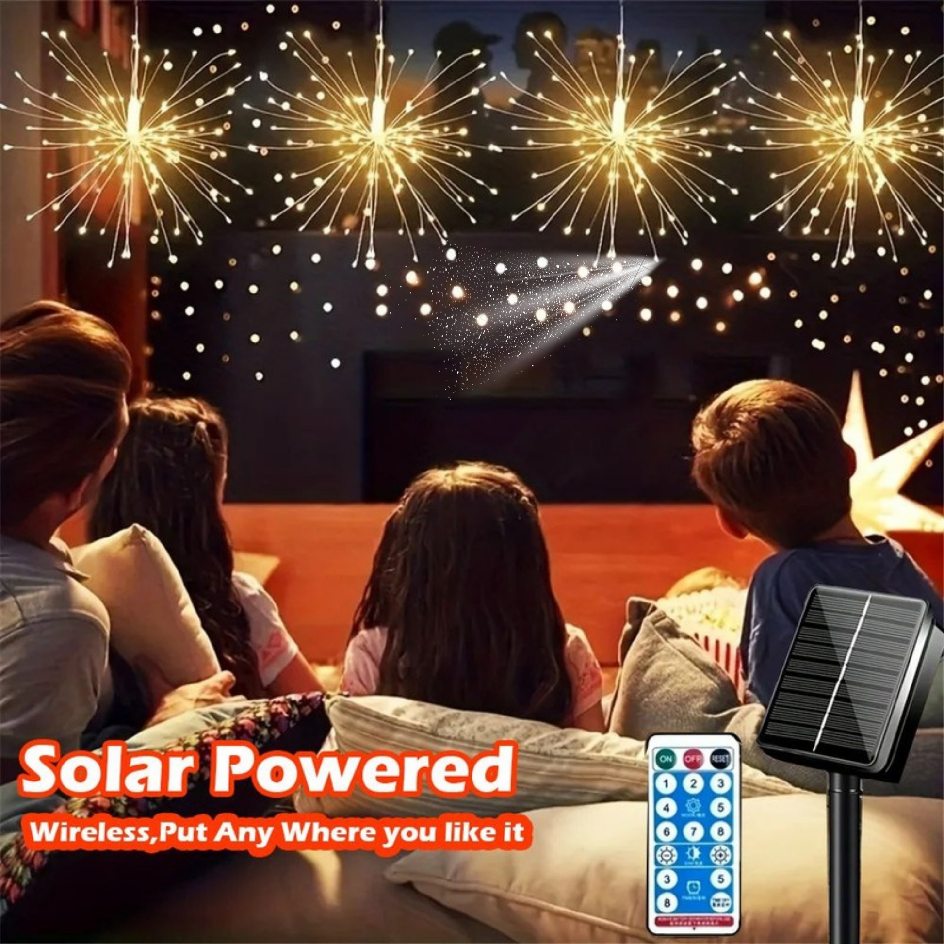 Imagina encender tus luces y ver cómo tu sala, balcón o patio se llena de destellos dorados que simulan fuegos artificiales.